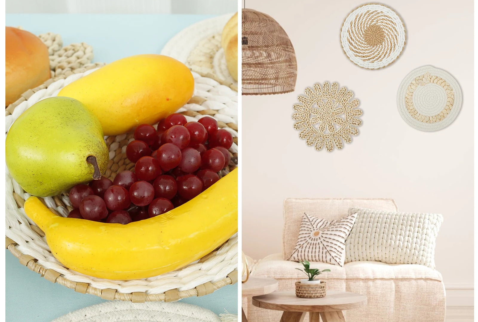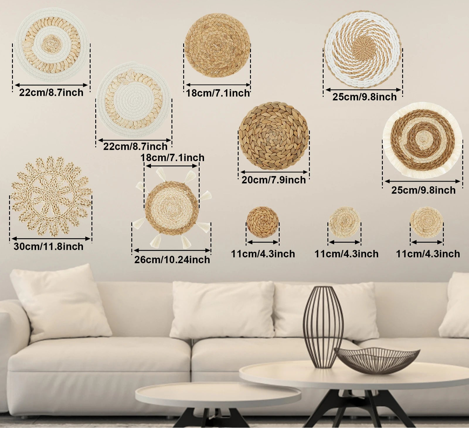 Lot de 11 décorations murales bohèmes artisanales en fibres végétales naturelles, pour une ambiance cocooning et chaleureuse dans toutes les pièces.